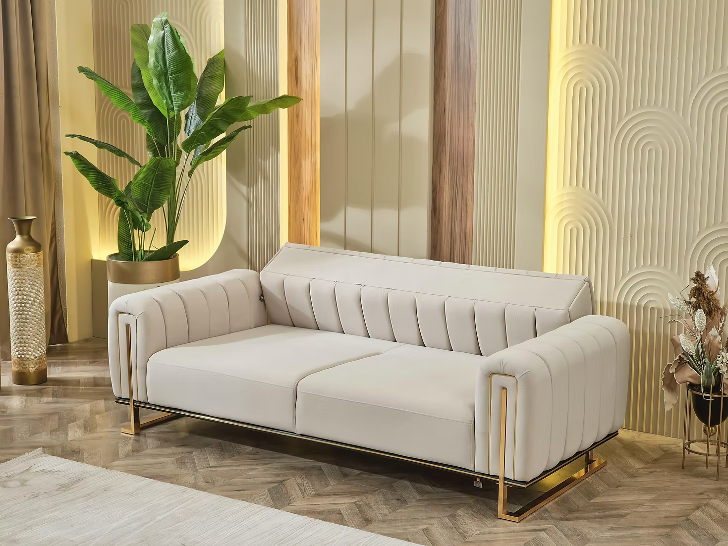 The 3-seater sofa and Loveseat easily converts into a bed, making it ideal for both everyday comfort and accommodating guests. Sleek stainless steel legs add a modern and regal touch while ensuring durability and stability.