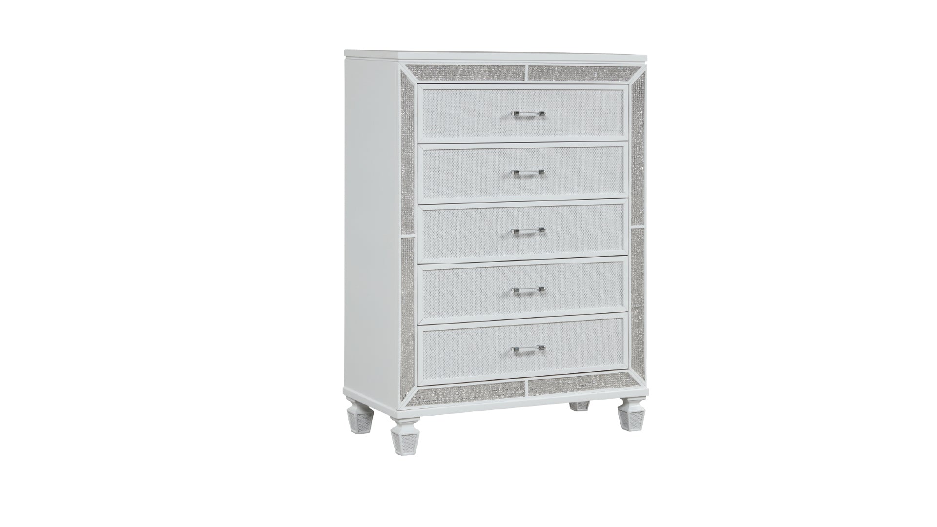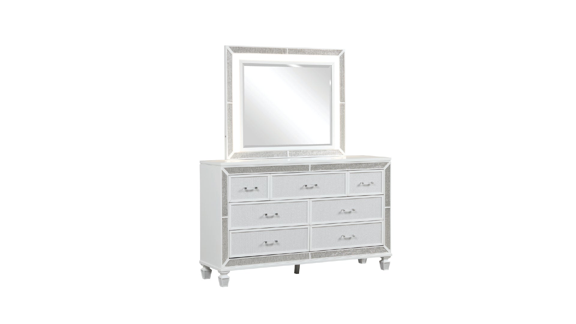 This glamorous 5-piece bedroom set is designed for those who love Hollywood-inspired luxury and crystal embellishments. Featuring a grand LED-lit headboard with a unique light pattern and shiny padded upholstery, this set instantly elevates your bedroom