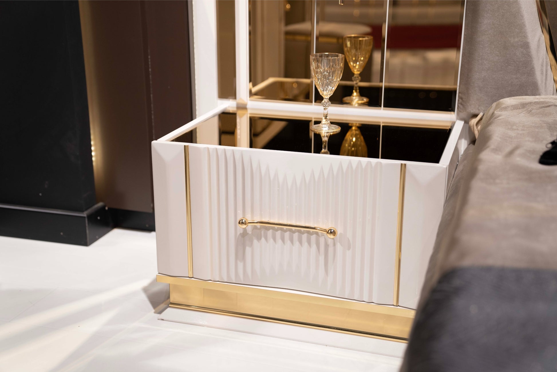 Nightstands: Functional yet glamorous, finished with rose gold glass panels for a refined touch.
