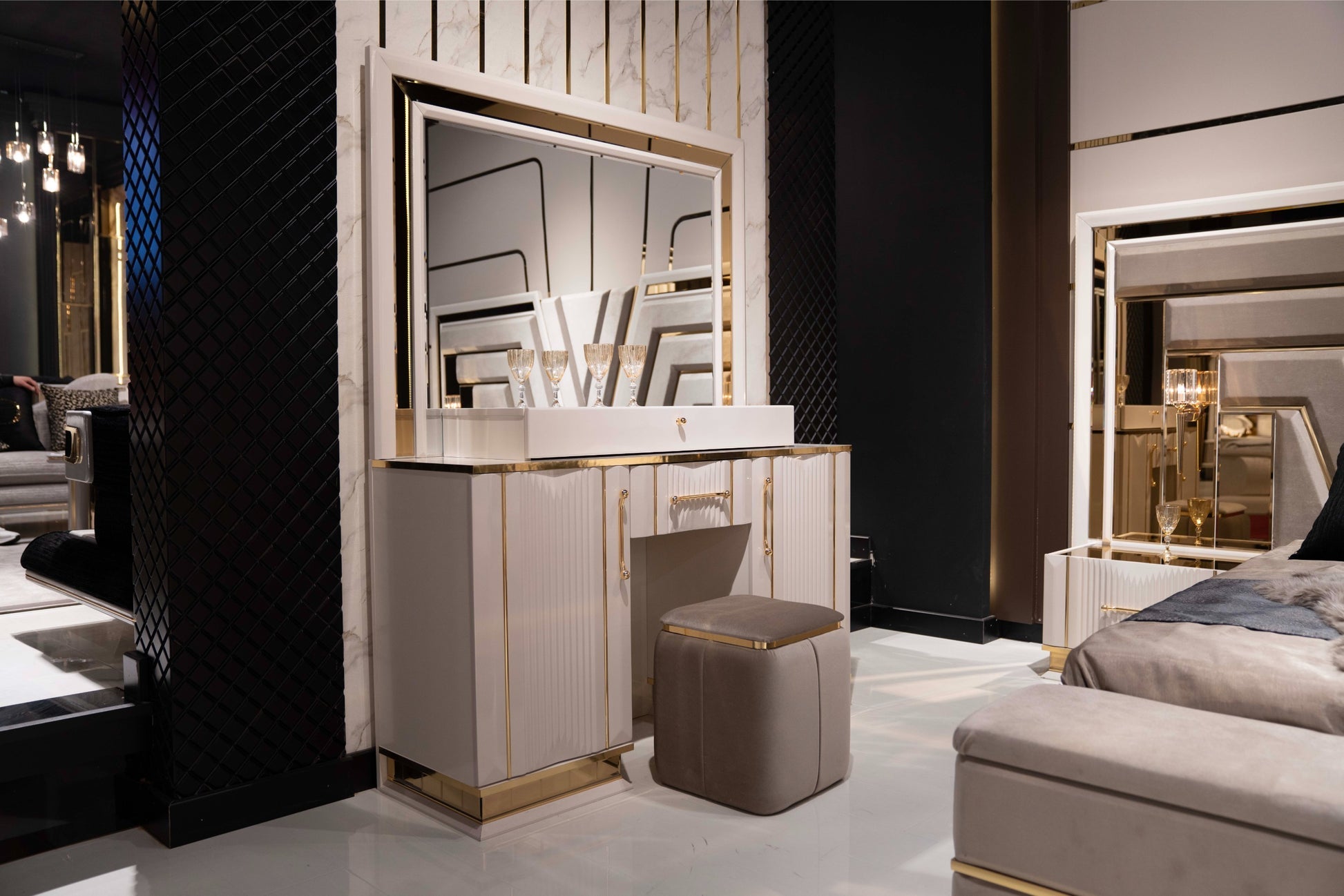 Dresser & Mirror: Spacious and sleek, designed with premium finishing and accented in rose gold glass to bring brightness and elegance to your room.