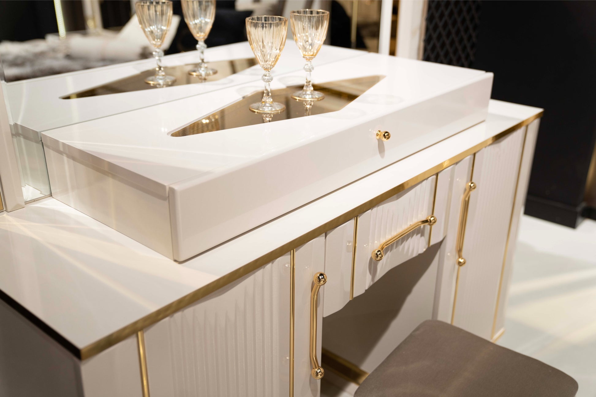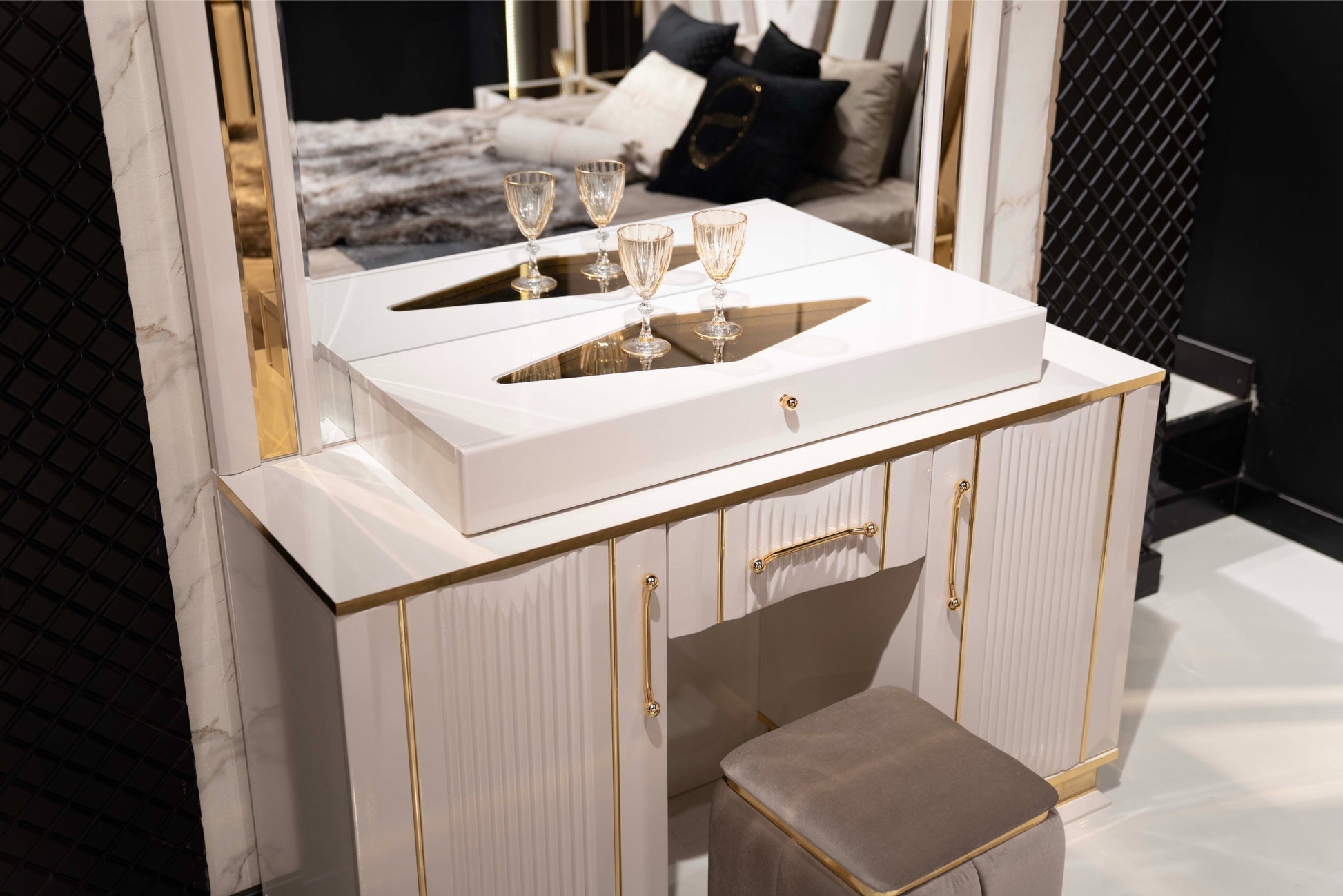 Bed: A striking centerpiece with a beautifully upholstered headboard, detailed carvings, and rose gold glass highlights that shimmer with sophistication.