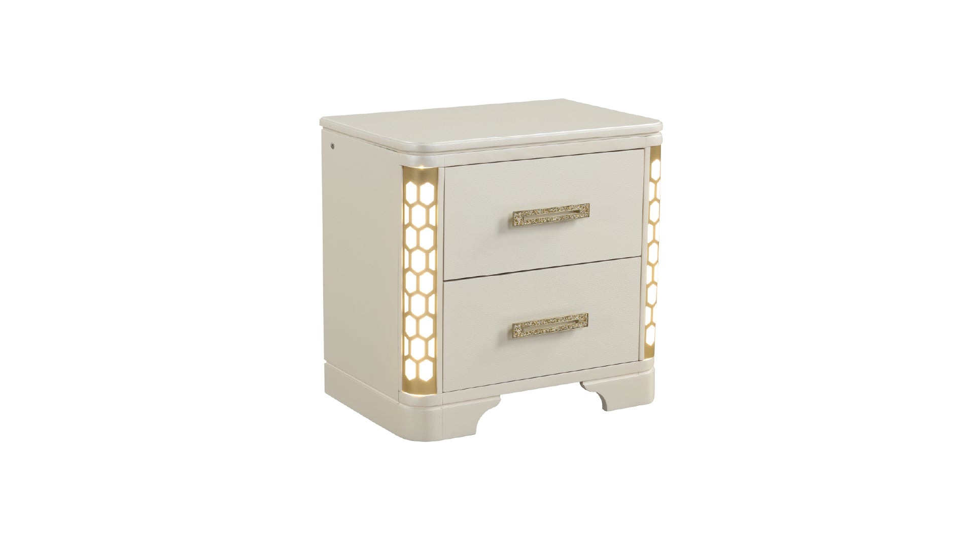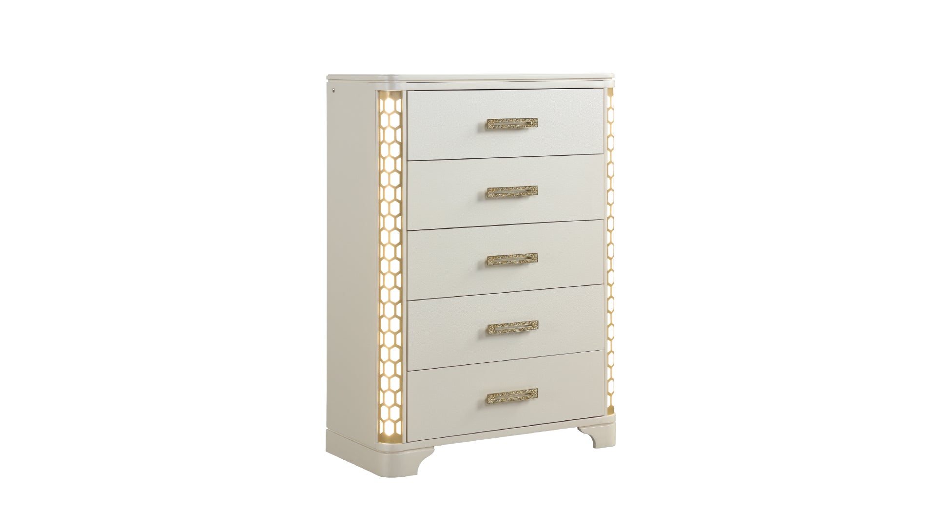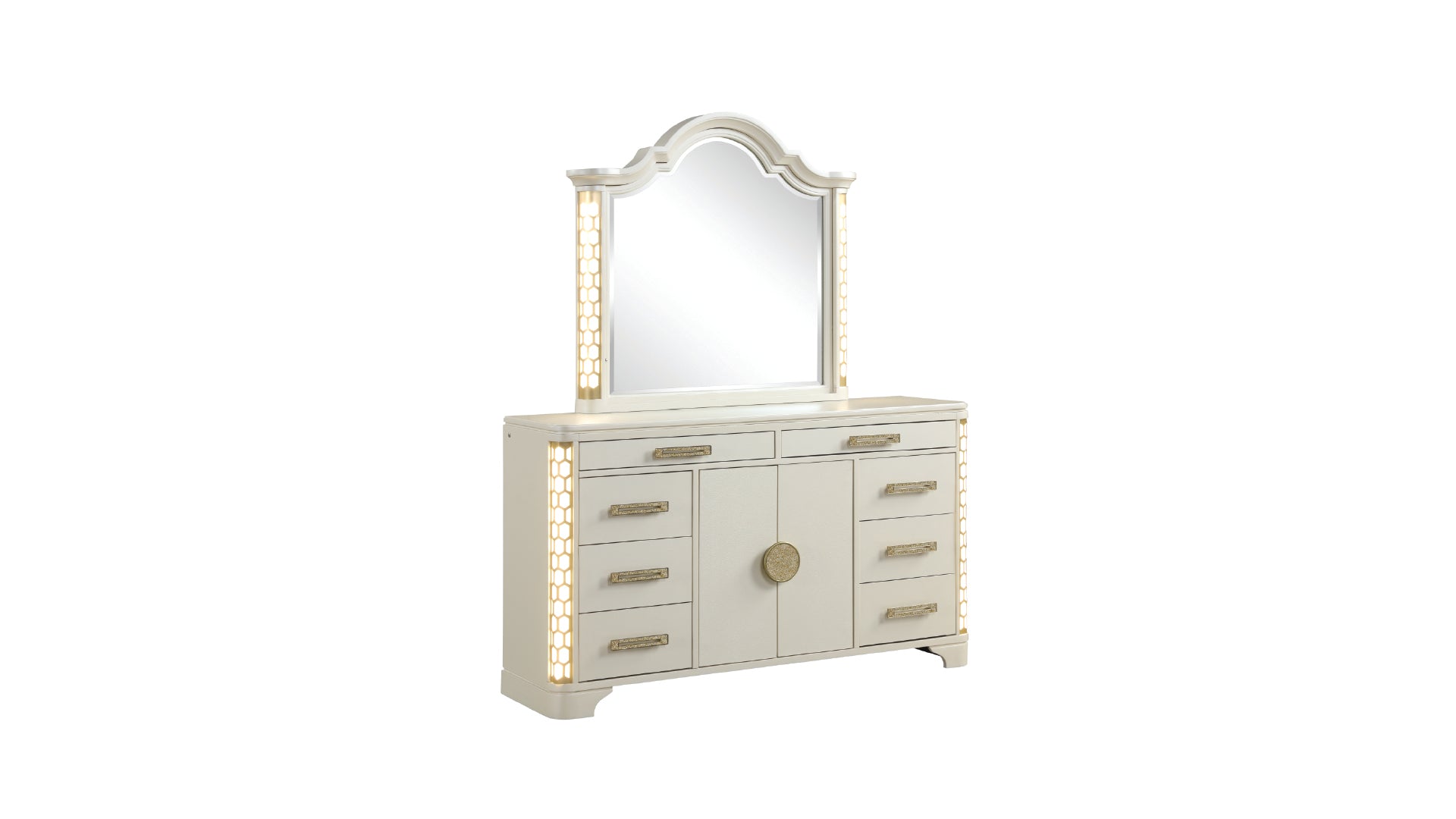 Step into luxury and sophistication with this stunning 5-piece bedroom set, featuring a grand tufted bed, dresser, mirror, nightstand, and chest. Designed to make a bold statement, the set showcases an elegant cream finish with gold accents, intricate detailing, and LED-lit panels for a touch of glamour. The tufted PU leather headboard and footboard, adorned with crystal button accents, exude opulence and refinement. With spacious storage drawers and sleek gold-tone hardware, this collection is the perfect blend of style, functionality, and timeless elegance, creating a majestic bedroom retreat.