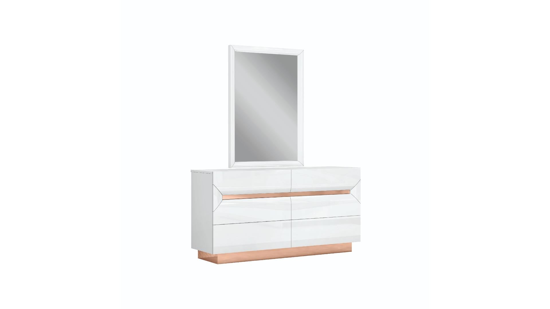 This modern bedroom set combines sleek design with functional elegance, featuring a striking white lacquer finish with warm rose gold accents. The geometric headboard design adds a contemporary touch, while the spacious dresser, chest, and nightstand provide ample storage. Crafted from durable materials with soft-closing drawers, this set ensures both style and convenience. Perfect for those looking to elevate their bedroom with a refined and minimalist aesthetic.